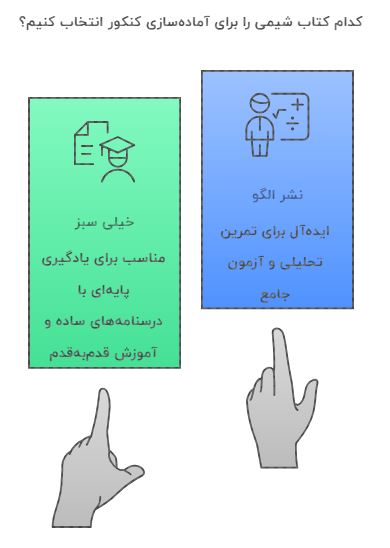 انتخاب بین شیمی خیلی سبز و شیمی نشر الگو به سطح، سبک یادگیری و زمان باقی‌مانده تا کنکور بستگی دارد. خیلی سبز با درسنامه‌های جامع و تست‌های متنوع، برای دانش‌آموزان متوسط که نیاز به یادگیری از پایه دارند، مناسب‌تر است. نشر الگو با تست‌های چالشی و تکنیک‌های پیشرفته، دانش‌آموزان قوی را برای سؤالات پیچیده کنکور آماده می‌کند.
